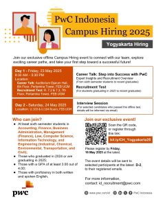 Join us for PwC Indonesia Campus Hiring 2025 📅 Friday, 23 May 2025 ⏰ 08.30 – 17.30 📍 Kampus FEB UGM Scan the QR code