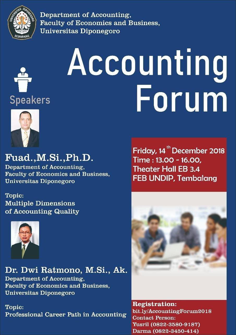 #Late post… Last accounting forum of 2018 was held on December 14, 2018. Two internal speakers (i.e. Fuad, Ph.D. and Dr. Dwi Ratmono, Ak., CA) discussed two relevant topics in Accounting. Dr. Fuad elaborates on how qualities of accounting information cannot be simply measured using single indicators. Based on prior normative deduction and empirical evidences, Dr. Fuad elaborates how accounting information is determined by multiple dimensions including earnings persistence, earnings management, earnings persistence, accounting value relevance, timely loss recognition, accounting conservatism and so on .