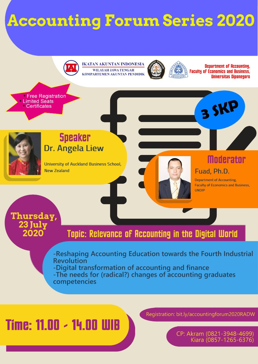 The last accounting forum was held on 23 of July 2020. The theme of this event is Relevance of Accounting in Digital World by Dr. Angela Liew from University of Auckland Business School, New Zealand. The moderator for the event is Fuad, Ph.D. There were more than 900 unique registrations were received for the event despite the fact that only less than 60% subsequently attended the event and filled up and passed the post test that we conducted to minimize the presence of free riders in our accounting forum series. Since the event was free and open for public, it was mostly attended by practitioners, students and lecturers from other universities.