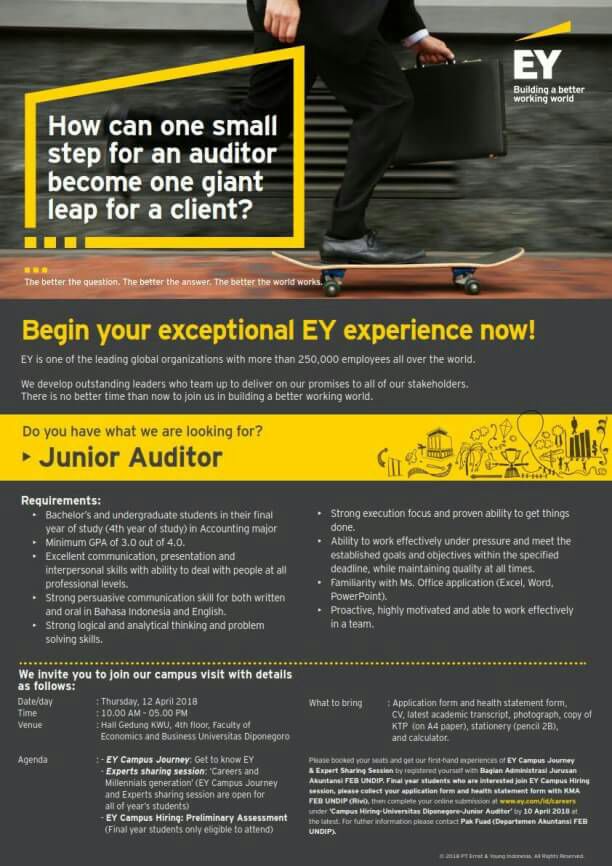 Please bring all of the requierements above & also examination board (papan LJK)! So, don’t miss this chance, join the event, and enjoy the exceptional experience in EY!
