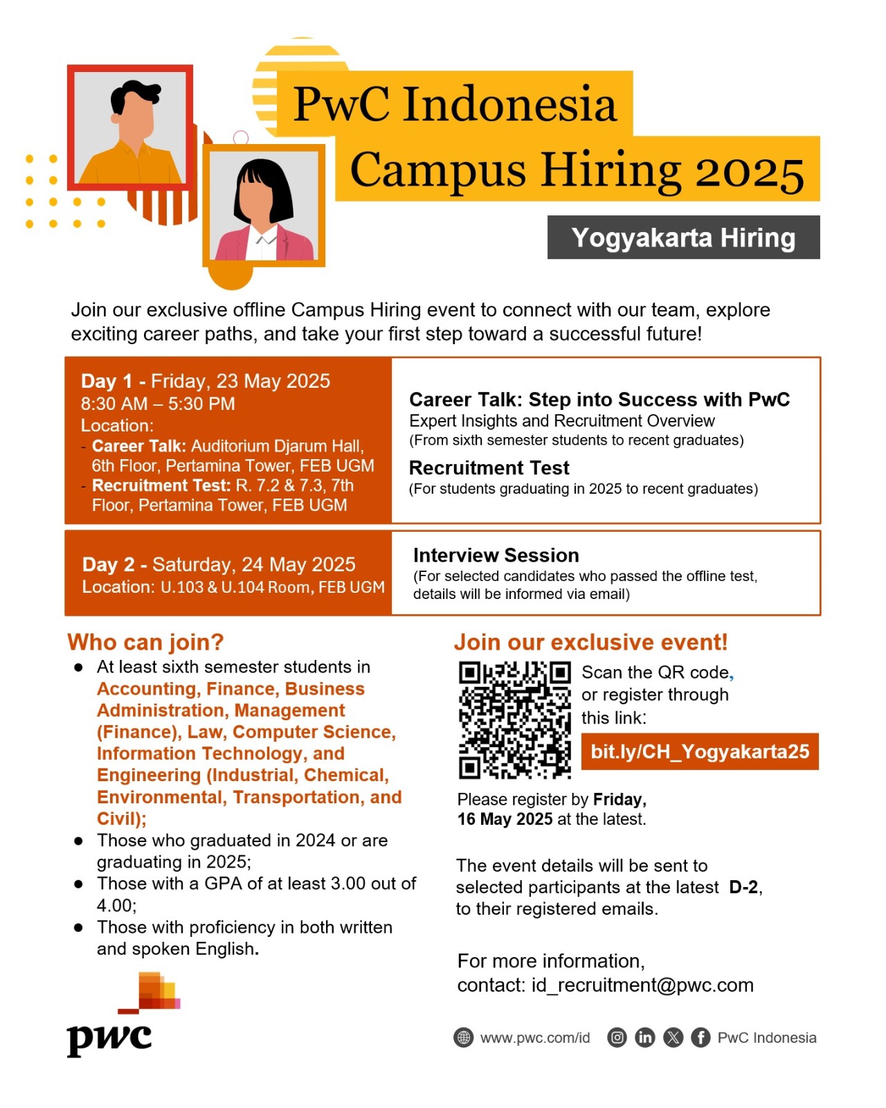 Scan the QR code or register at https://bit.ly/CH_Yogyakarta25 For more information, contact: id_recruitment@pwc.com