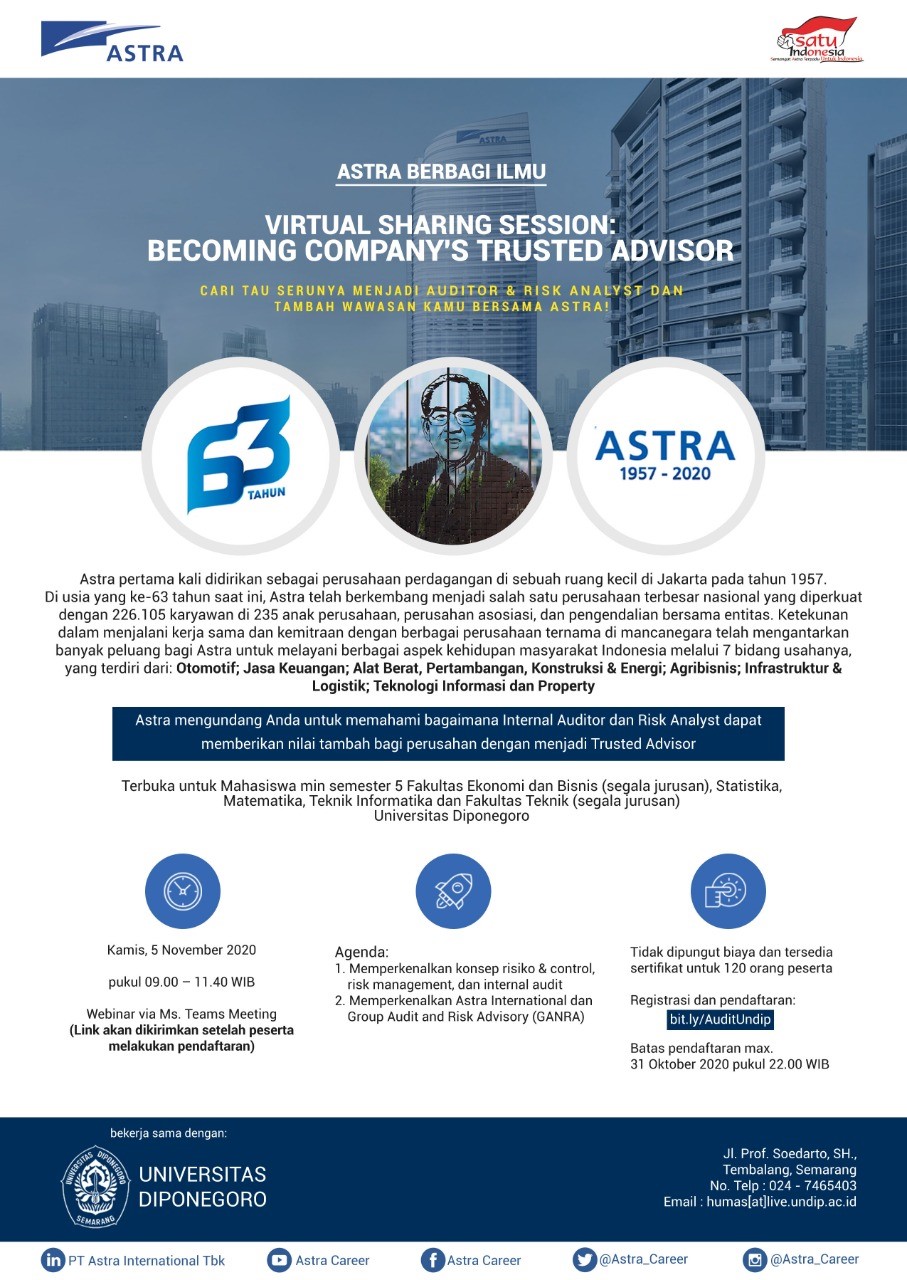 Astra International Tbk akan mengadakan sharing pengetahuan secara virtual kepada mahasiswa Akuntansi Universitas Diponegoro pada 5 November 2020. Astra International Tbk. akan memberikan wawasan kepada mahasiswa mengenai karir sebagai auditor internal dan analis risiko di suatu perusahaan.